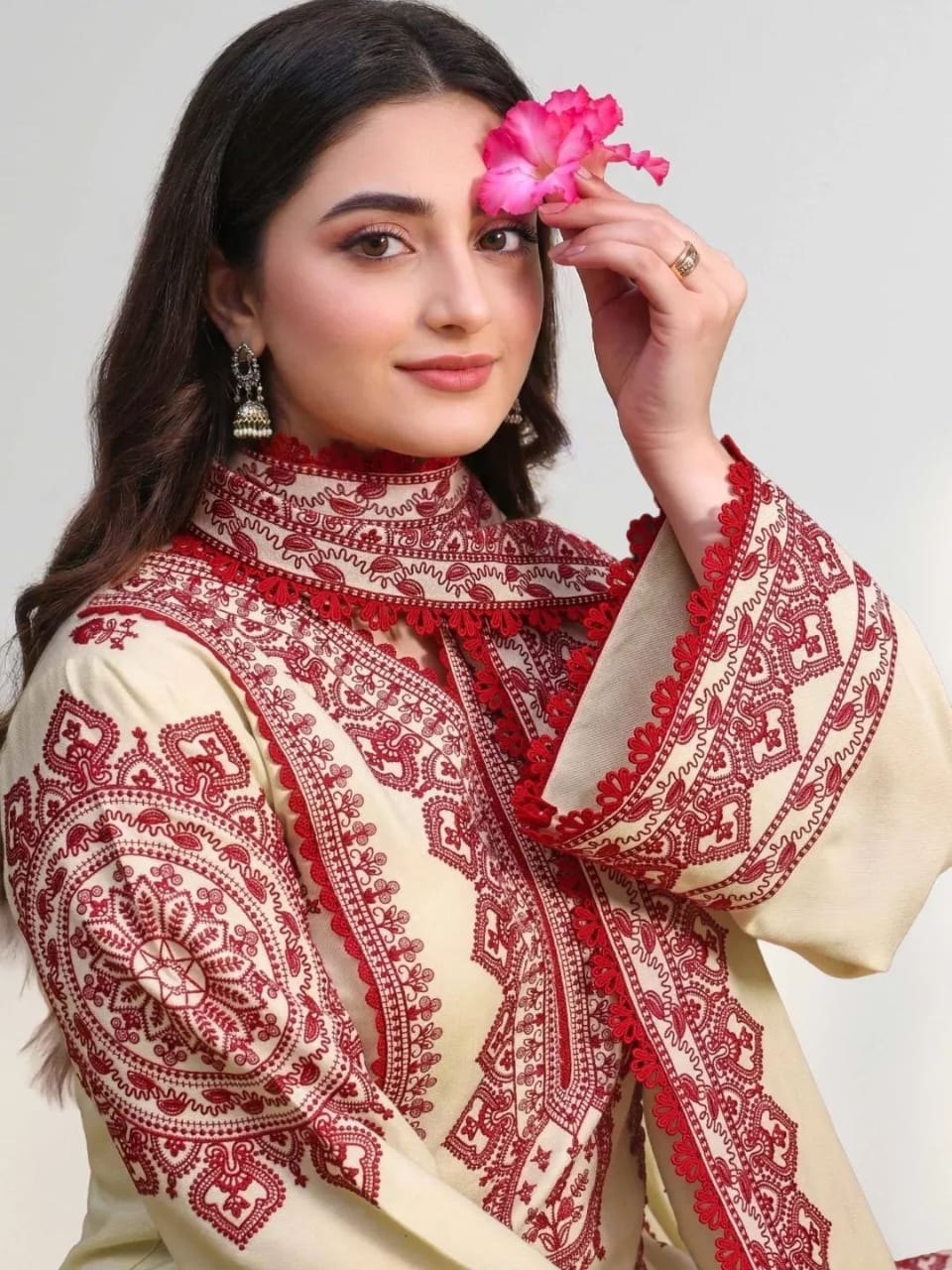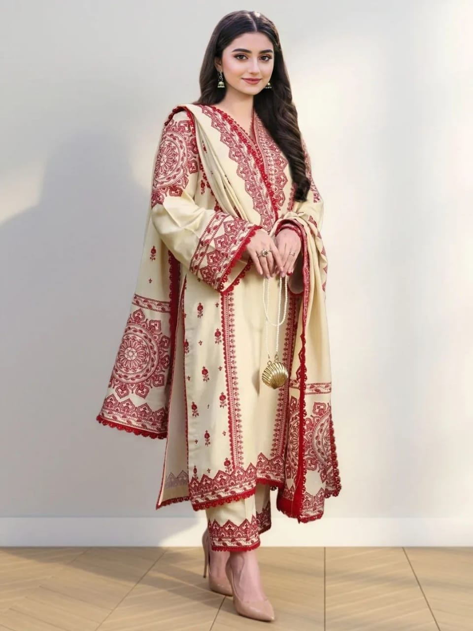 This elegant 3-piece suit features a soft ivory base highlighted with rich maroon traditional embroidery. The straight-cut kurta is beautifully detailed on the neckline, sleeves, and borders, paired with a matching embroidered trouser for a refined look. Finished with a coordinated dupatta, this ensemble is perfect for festive occasions and graceful everyday wear.
